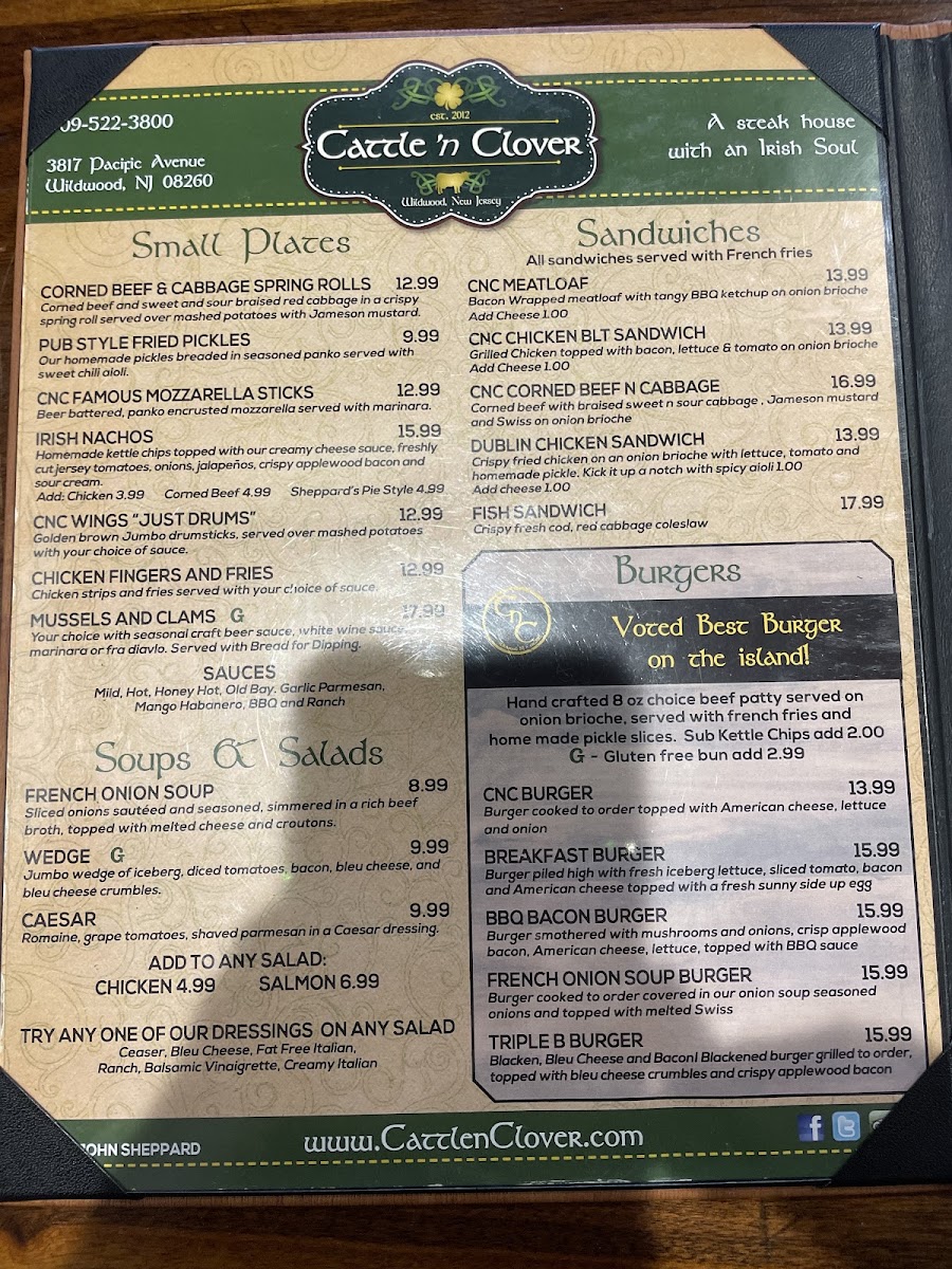 Welcome to Cattle 'n Clover, a hidden gem nestled at 3817 Pacific Ave in Wildwood, NJ. A short stroll from the beach, this culinary haven invites you in with a warm, cozy ambiance that effortlessly blends classic Irish charm with local Wildwood flair. If you're searching for a place where hearty comfort food meets attentive service, you've just found it.